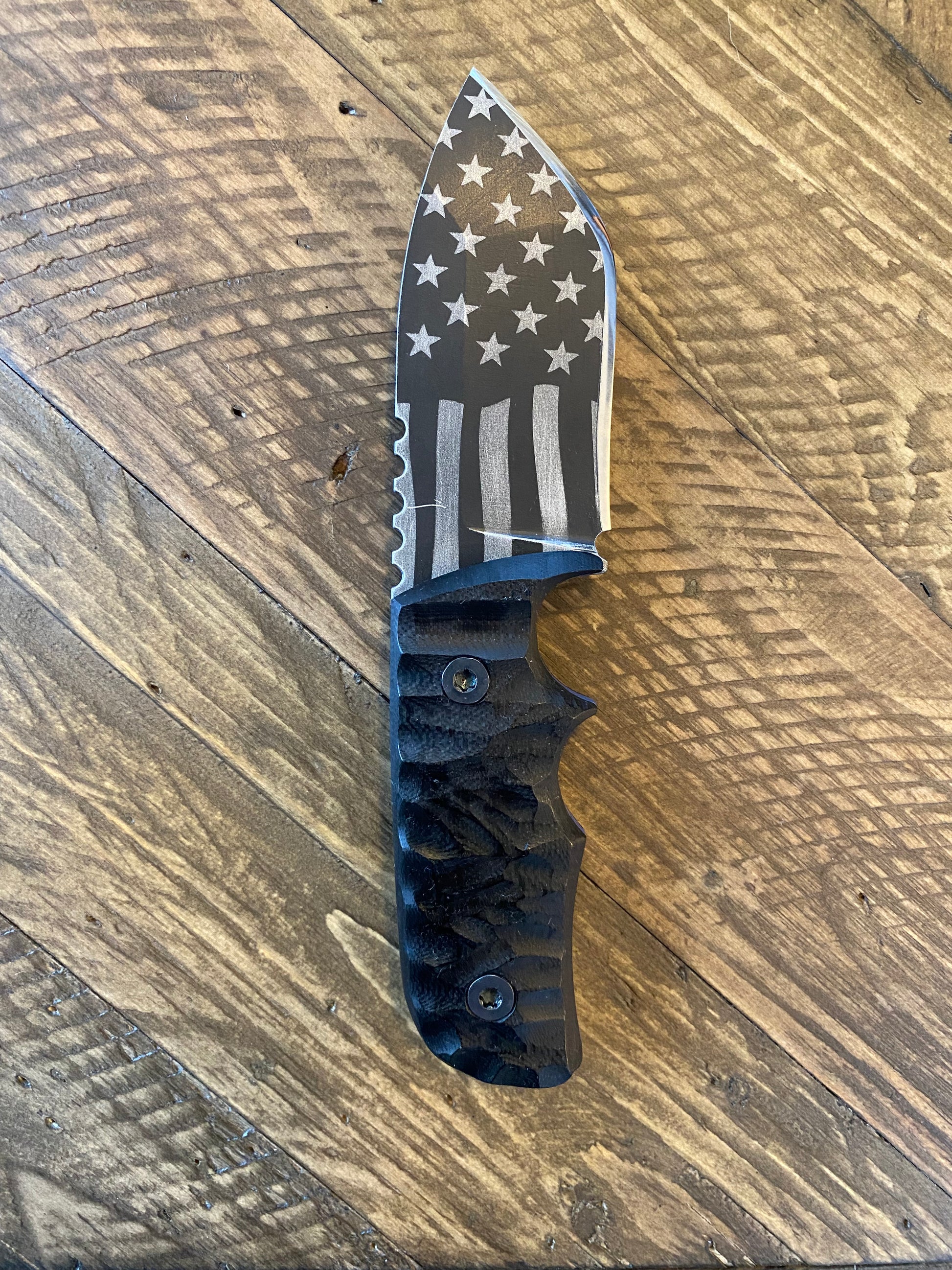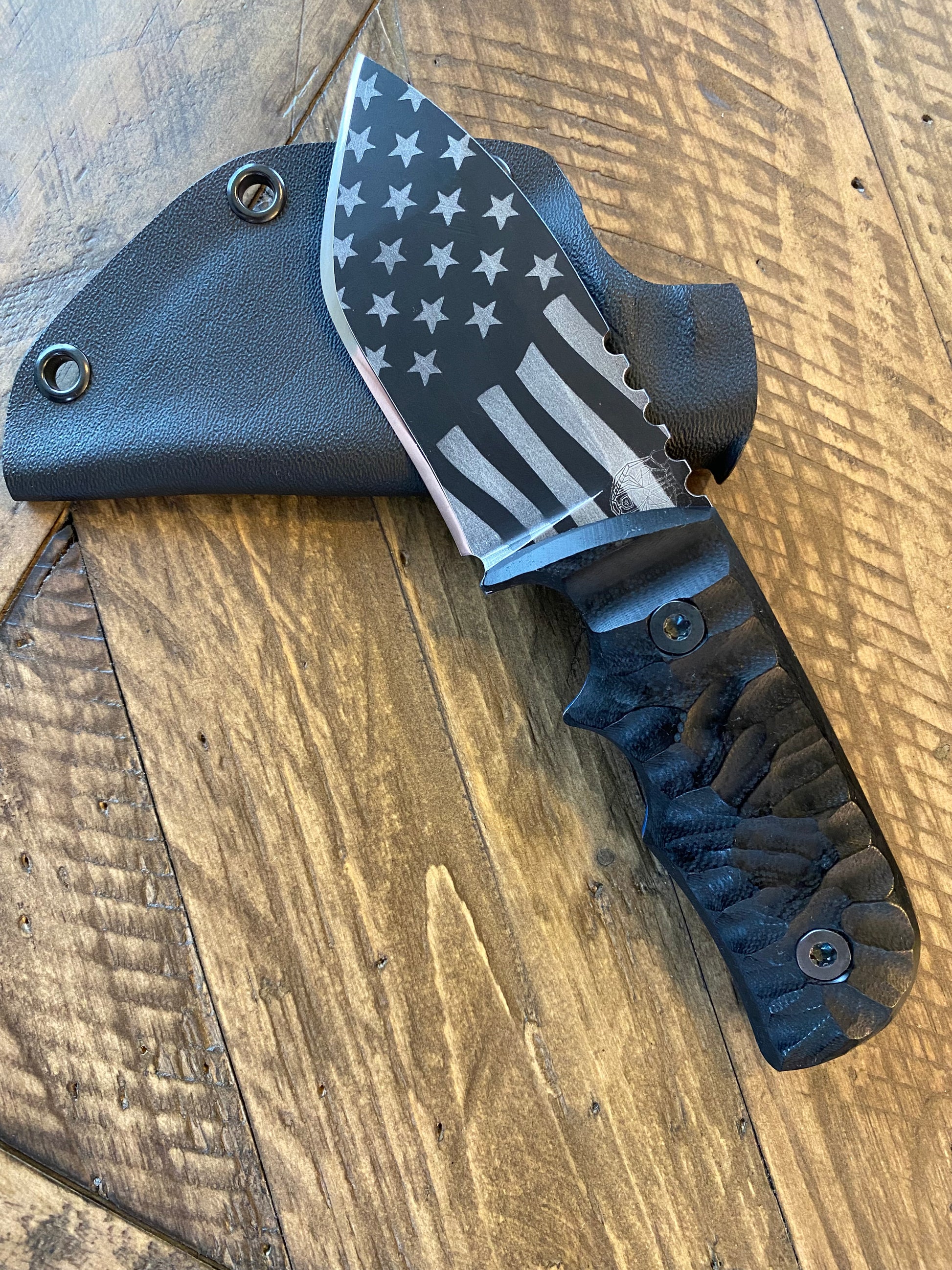 This Tuatara features a subdued American flag cerakote on the bevels and a blue cerakoted spine. The handles are black G10. The sheath is black Kydex and comes with a Tek-Lok and soft loops. Tek-Lok is also molle compatible.