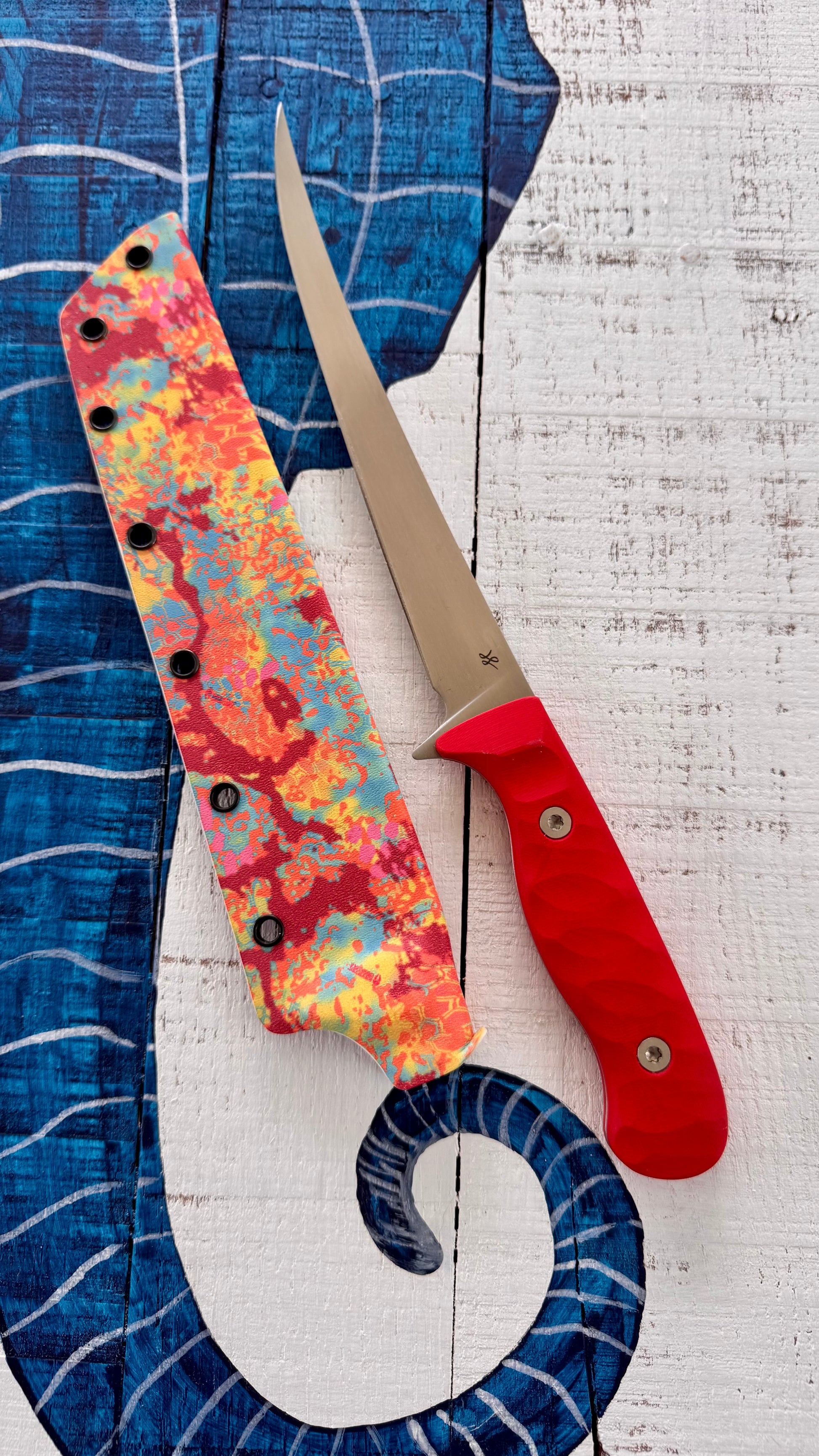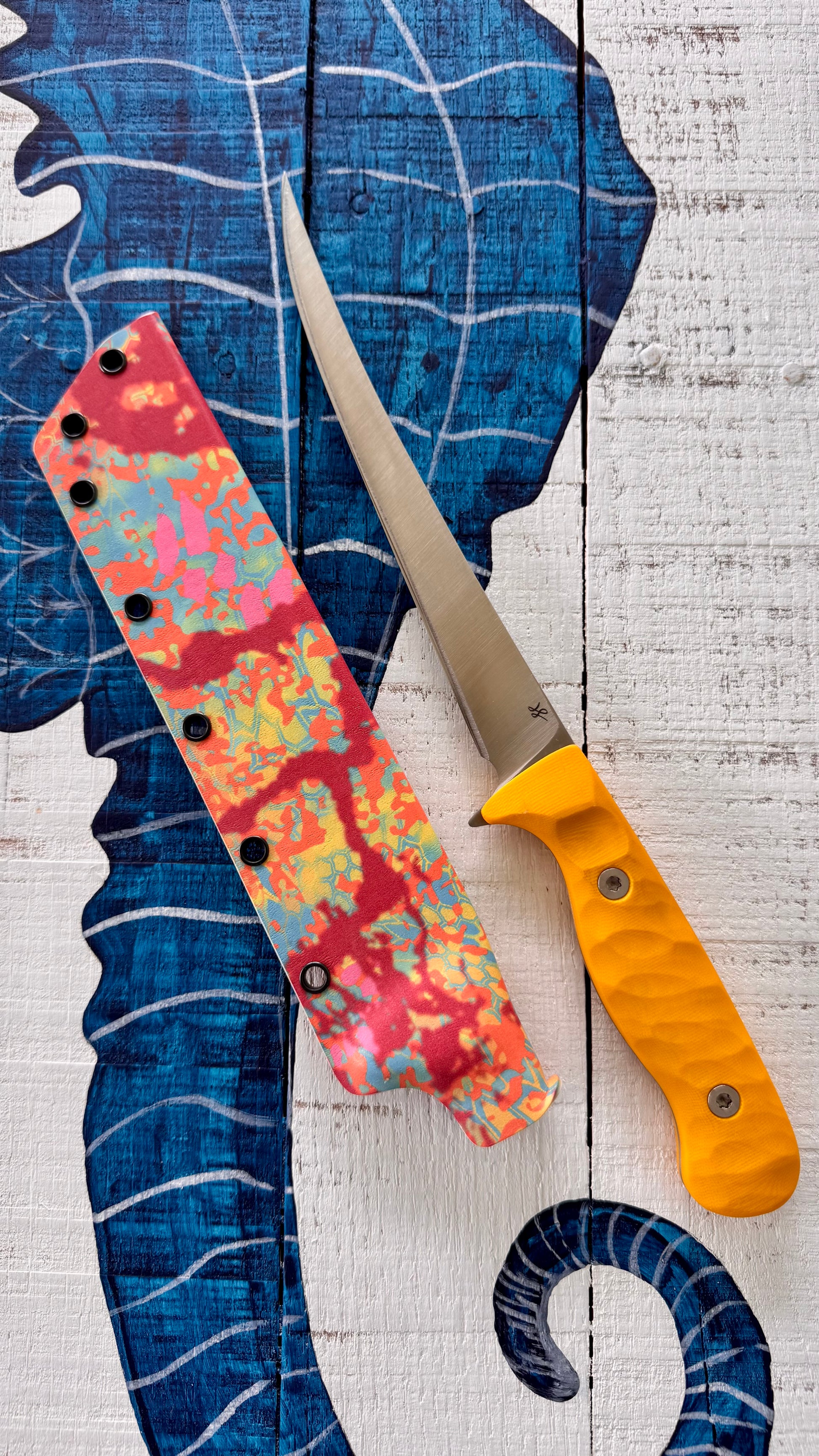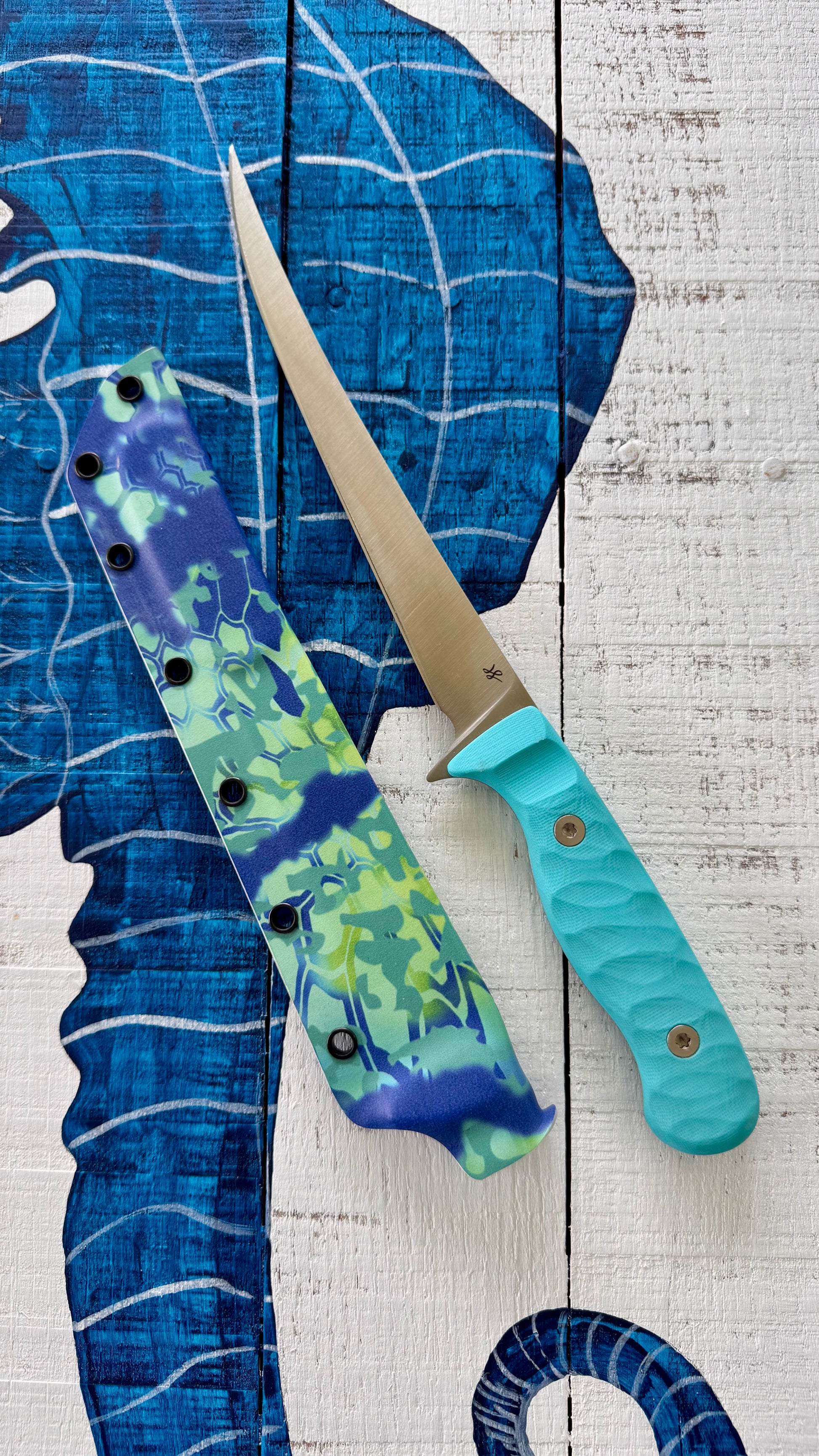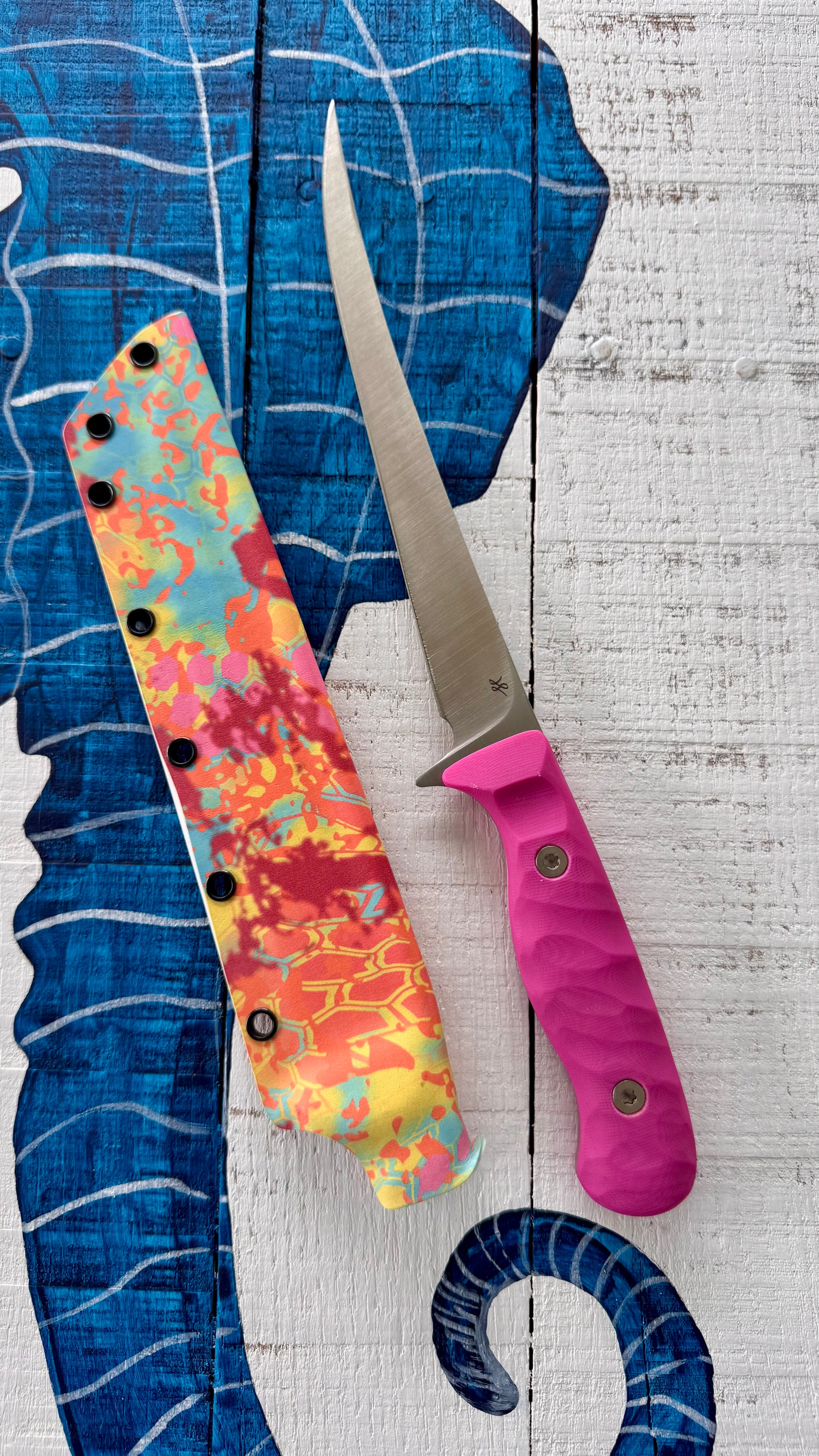 These knives are made by hand, as such there will be minor variances to each. The patterned sheaths may appear slightly different as well due to material patterning.